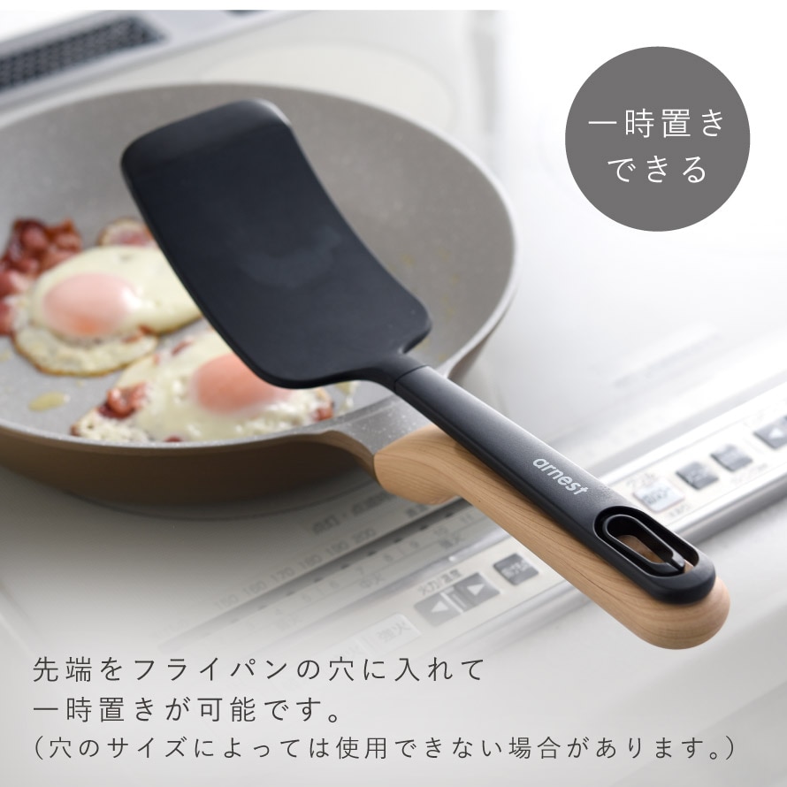 先端をフライパンの穴に入れて一時置きが可能です。(フライパンの形状や穴のサイズによっては使用できない場合があります。)