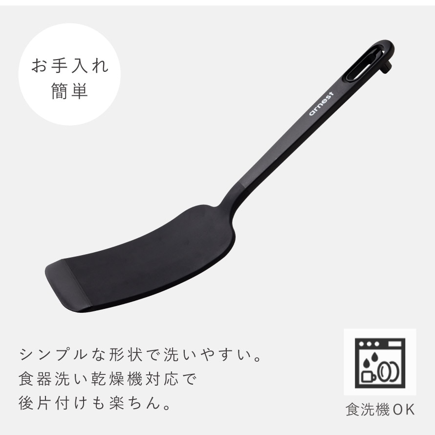 強度・耐熱性に優れたグラスファイバー入りナイロン製。コシがあり、こびりつきやすい食材にも力を入れて差し込めます。食洗機対応で、毎日のお手入れも簡単です。