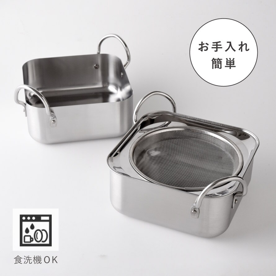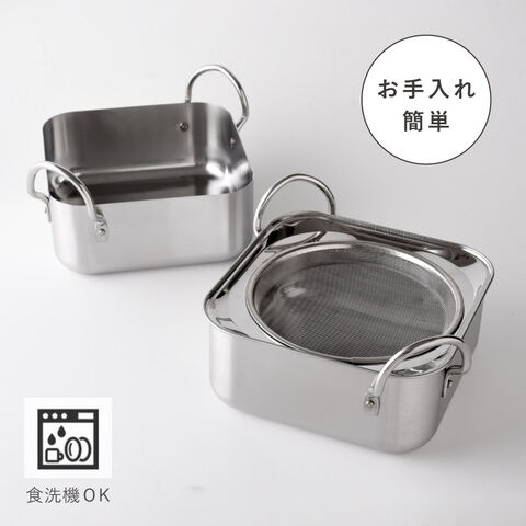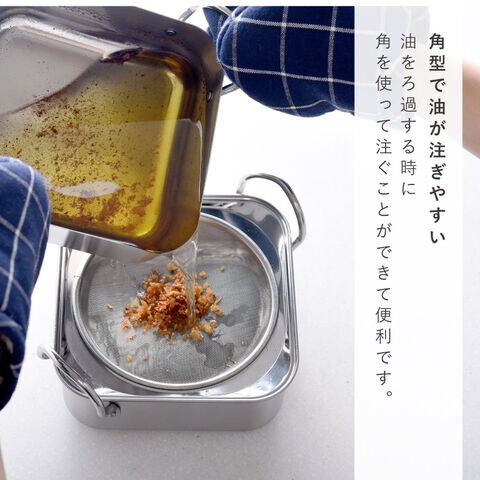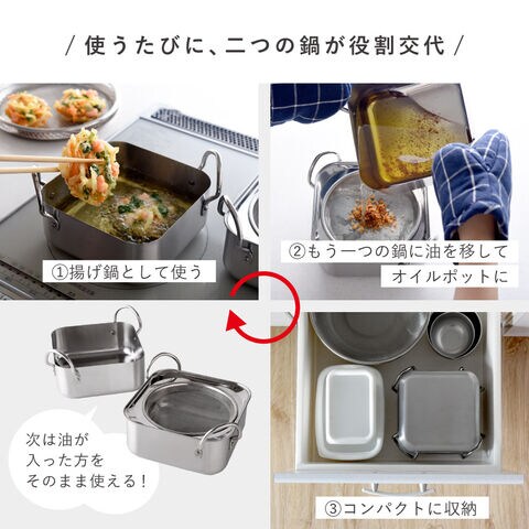 毎日のお弁当作りで揚げ物をする方にうれしい、揚げ鍋とオイルポットがひとつになった2WAY仕様のスクエア型の揚げ鍋セットです。