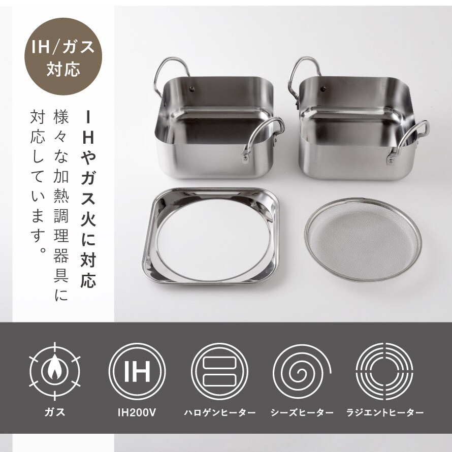 ガス火・IHのどちらにも対応しており、忙しい朝のお弁当作りから普段の食卓まで幅広く活躍。場所を取らず、少量の油で効率よく使える、毎日忙しい主婦の味方になる揚げ鍋セットです。