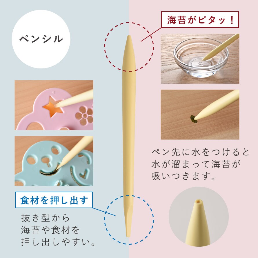 「お水でピタっと海苔ペンシル」は、小さな海苔パーツも狙った場所に簡単に貼り付けられる便利アイテム。ペン先のくぼみに水を含ませることで、海苔が吸い付くように密着します。反対側のヘラ部分は、抜き型に残ったチーズやハムなどの食材を押し出すのに便利です。