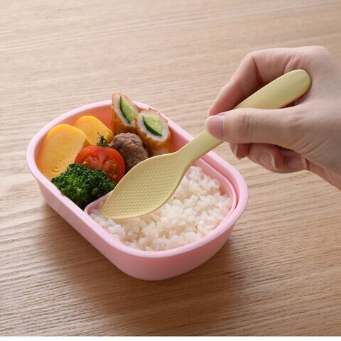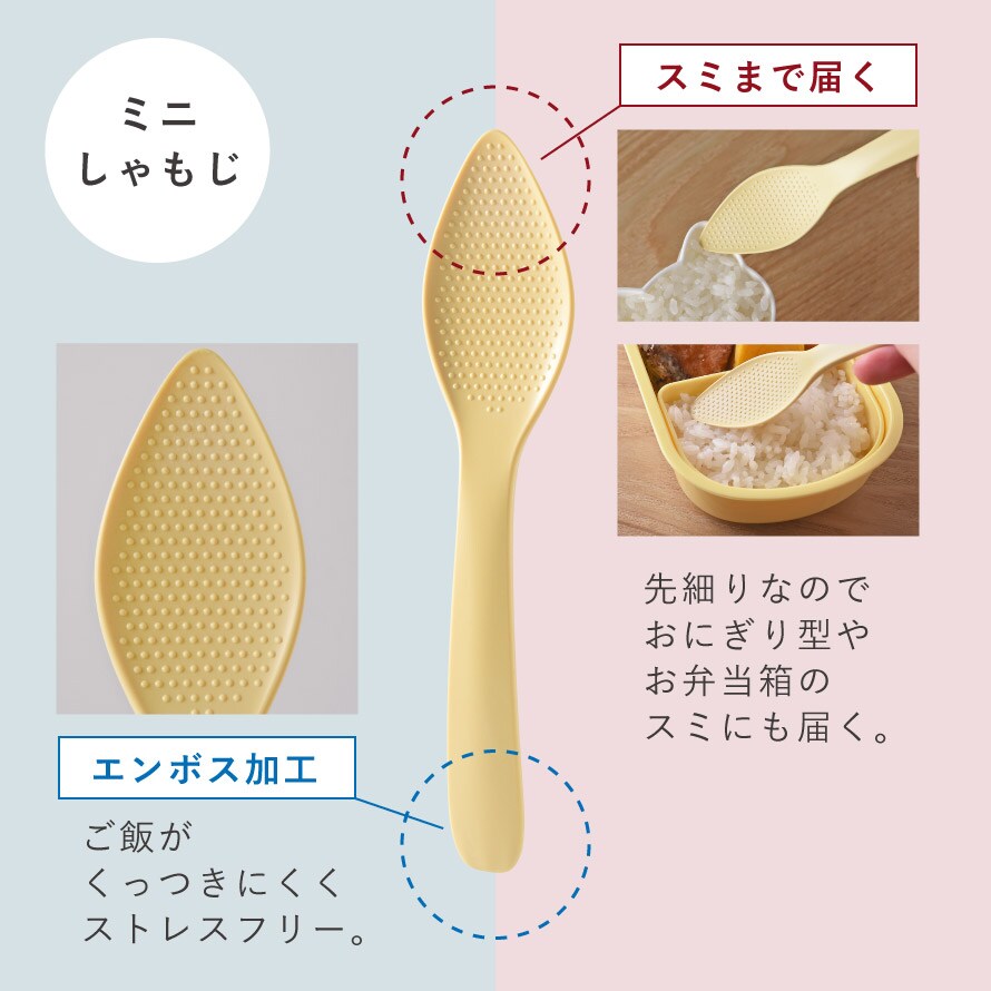 「スミまでとどくミニしゃもじ」は、スプーンサイズで小回り抜群。先端が尖った形状で、お弁当箱やおにぎり型の隅まできれいにご飯を詰められます。エンボス加工でご飯がくっつきにくい仕様です。