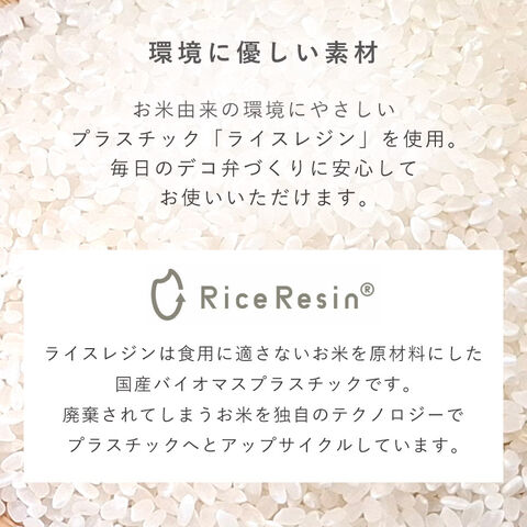 お米由来の環境にやさしいプラスチック「ライスレジン」を使用。日本製なので、毎日のデコ弁づくりに安心してお使いいただけます。軽くて持ちやすく、水洗いも簡単なのでお手入れもラクラクです。