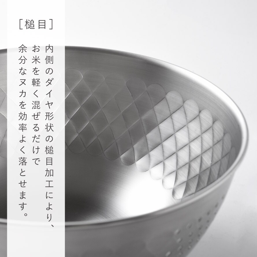 米研ぎはスピードが味を左右します。内側のダイヤ形状の槌目加工により、お米を軽く混ぜるだけで余分なヌカを効率よく落とせます。
