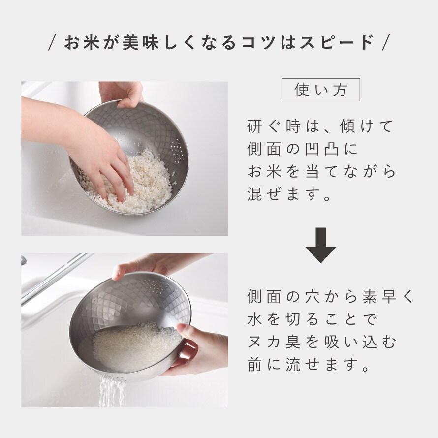 側面の水切り穴から素早く水を切れるため、ヌカ臭を吸い込む前に次の工程へ進め、炊き上がりの香りと旨みを引き出します。