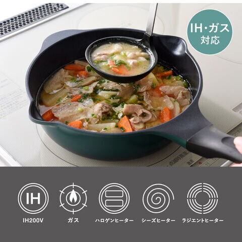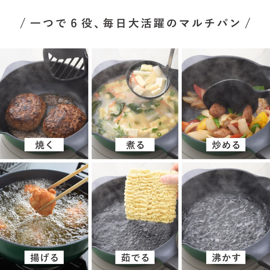 「焼く・煮る・炒める・揚げる・茹でる・沸かす」の1台6役。底面の広さ・深さ・丸みを兼ね備えたマルチに使えるこだわりの形状。