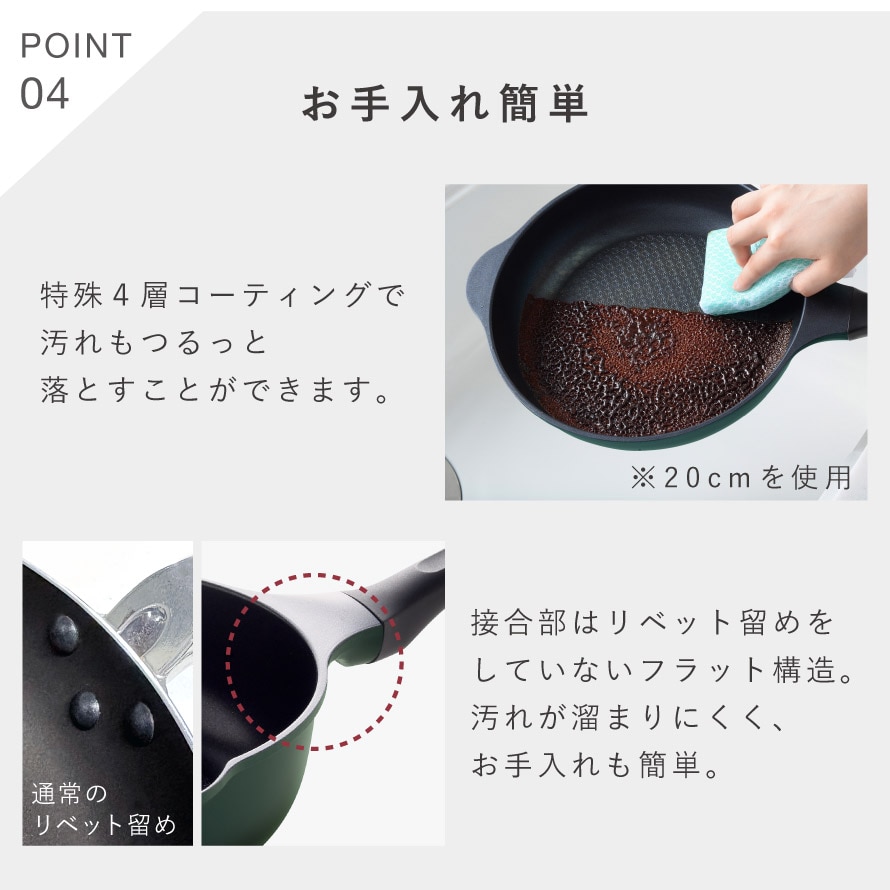 取り回しが良く、洗いやすさも魅力。本体とハンドルの接合部はリベット留めをしていないフラット構造なので、汚れが溜まりにくく、お手入れも簡単です。