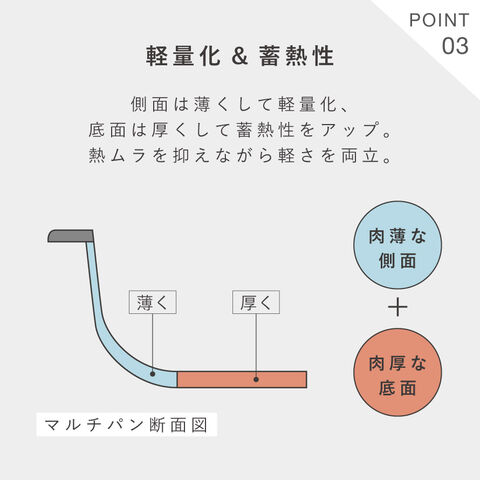 熱源に当たる底面はしっかり肉厚を確保しながら、側面の余分な厚みを削ぎ落とした特別設計。アルミダイカスト製法だからこそ実現できた超軽量仕様で、一度使うと重たいフライパンには戻れないほどの快適さです。