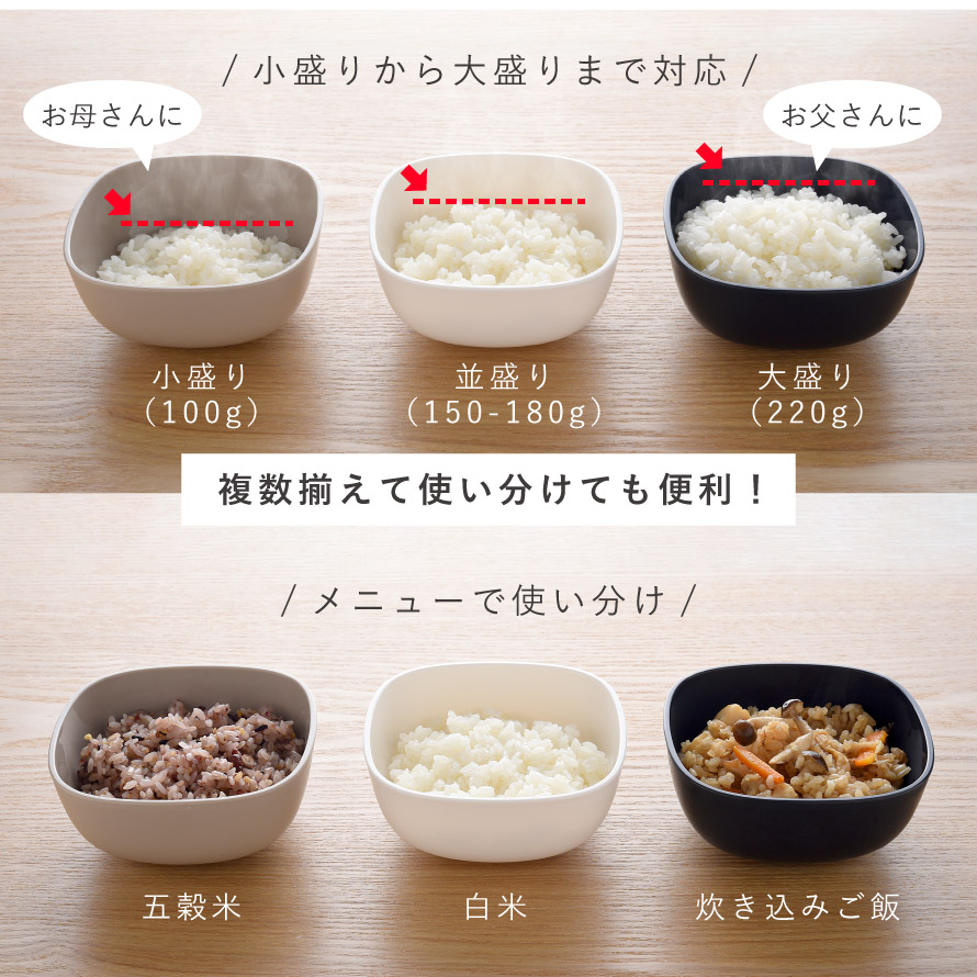 しゃもじにも使われる素材を使用し、ご飯がこびりつきにくく、内側はフラットで洗いやすい設計。軽くて持ちやすく、落としても割れにくいところも◎。