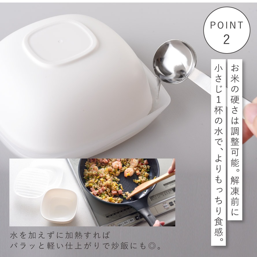 大さじ1杯の水を足せば、よりもっちりとした食感に。水を加えずに加熱すれば、パラッと軽い仕上がりで炒飯にもおすすめです。