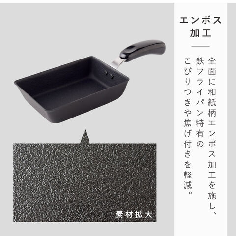 全面に和紙柄エンボス加工を施し、鉄フライパン特有のこびりつきや焦げ付きを軽減。食材がスムーズに返しやすく、きれいな仕上がりに。油なじみが良く、焼きムラが出にくいため、素材の美味しさを引き出した調理が可能です。