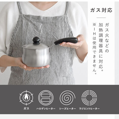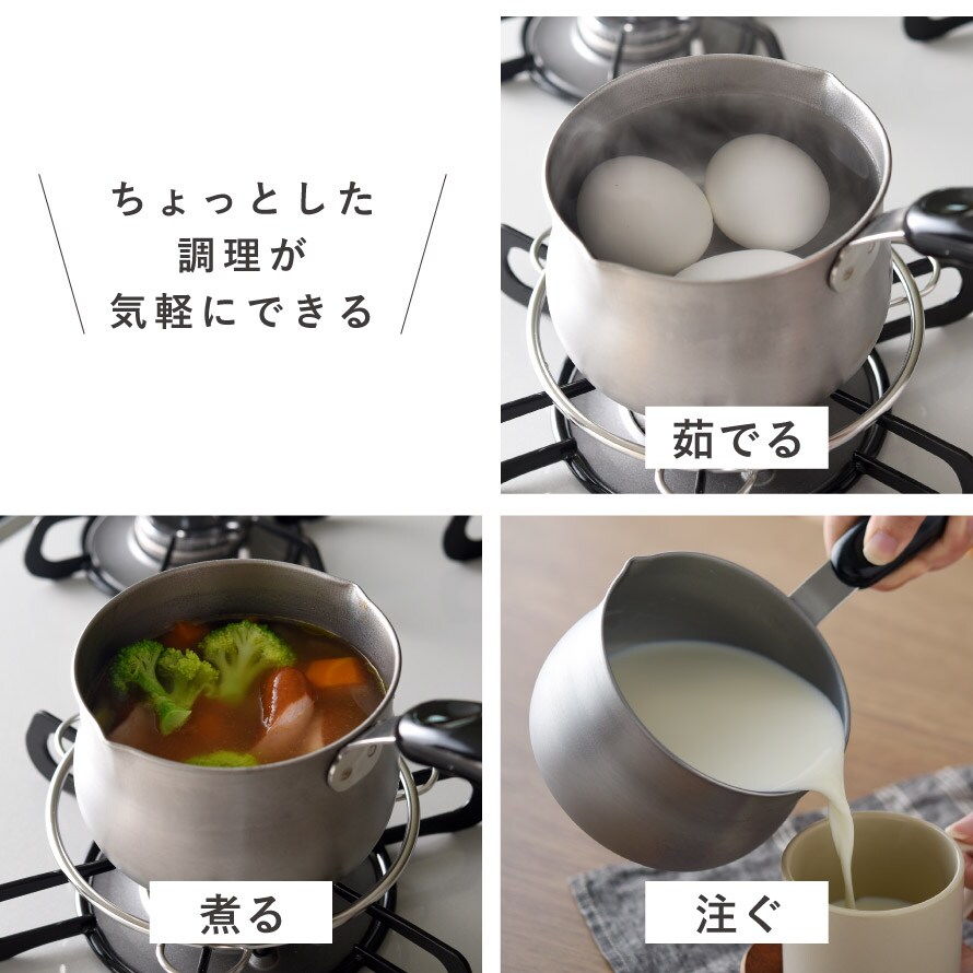牛乳やココア、インスタントスープを温めたり、少量のお湯を沸かしたりと、洗い物を増やさず手軽に使える鍋として活躍します。お弁当作りでは、ウインナーを1-2本だけ茹でる、野菜を少量下茹でするといった使い方にも便利で、忙しい朝の時短アイテムとして重宝します。また、軽くて扱いやすいので、シニア世代の方にも使いやすく、一人分の味噌汁やスープ、牛乳や甘酒を温める鍋としてもおすすめです。