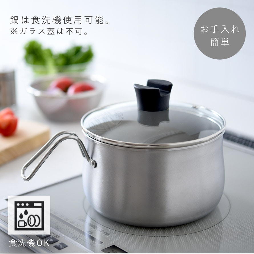| 材質 | 鍋/ステンレス鋼、ガラス蓋/強化ガラス製器具(全面物理強化)・フェノール樹脂、ステンレス鋼 |
