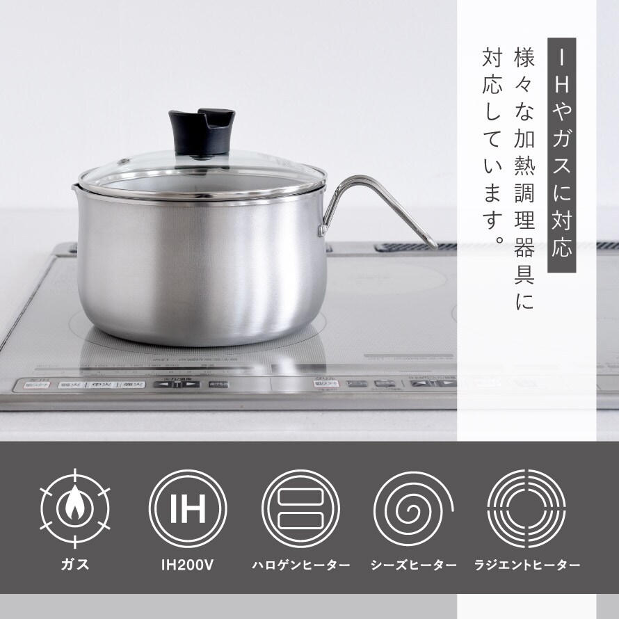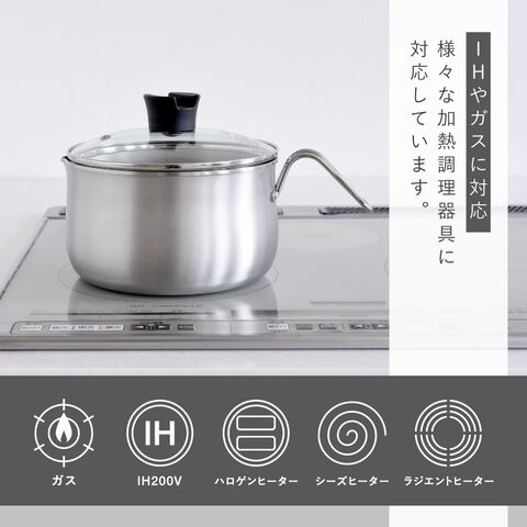| 備考 | ガス・IH(200V)・ハロゲンヒーター・シーズヒーター・ラジエントヒーター対応。 鍋本体のみ食洗機使用可能(ガラス蓋は不可)。 |