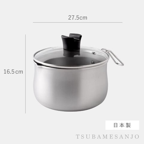 | サイズ | 鍋本体/幅27.5×奥行19×高さ11.5(ガラス蓋含む高さ16.5cm)、鍋内径/18cm×深さ11cm×底厚0.7mm、ガラス蓋/直径19×高さ6cm |