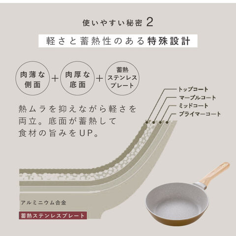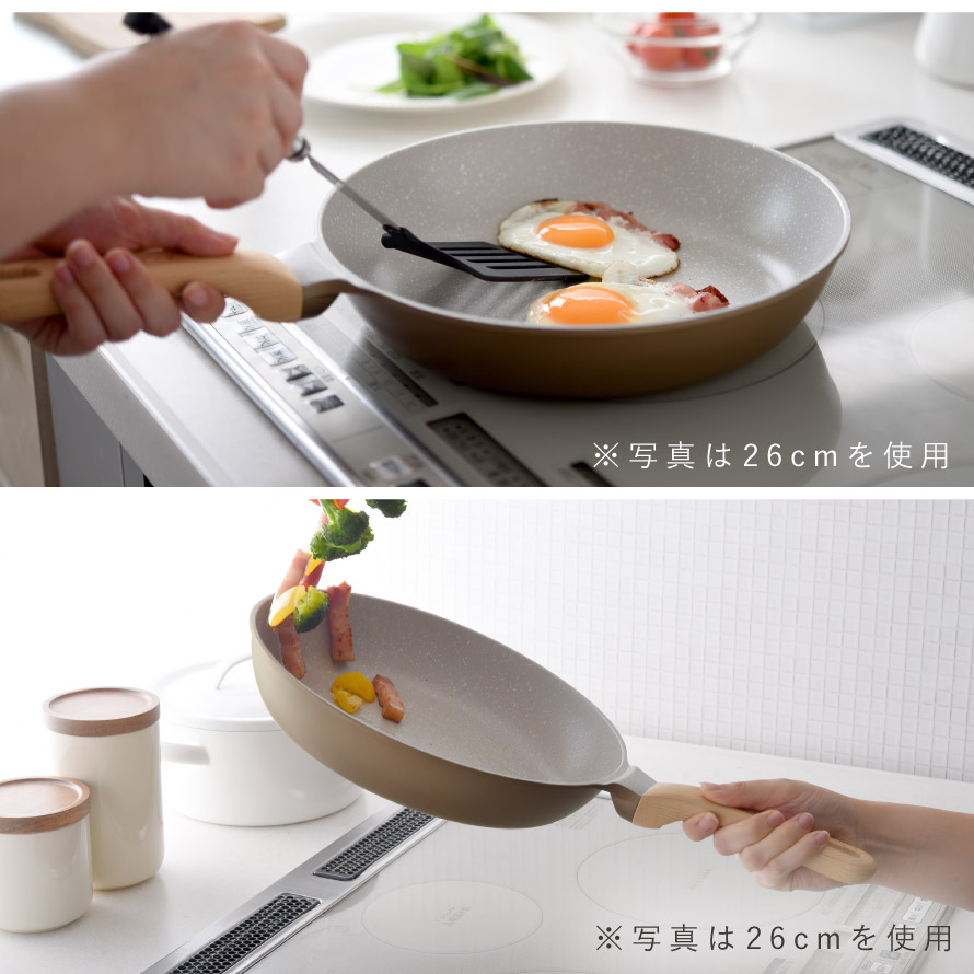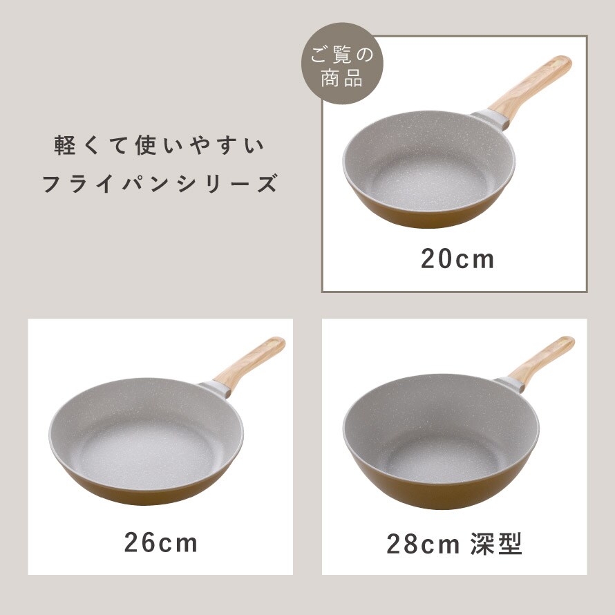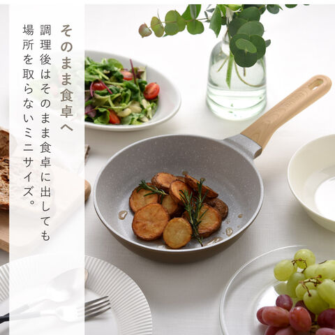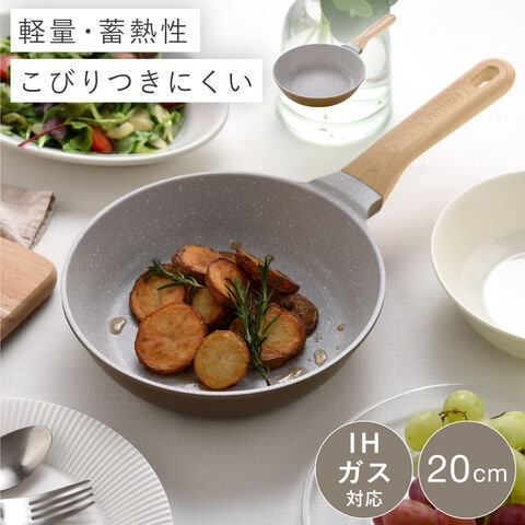 ふわっと軽く、蓄熱性で美味しく調理できる20cmフライパン。朝食づくりから夕食のおかずまで、日常使いにちょうどよく、キッチンにやさしくなじむナチュラルカラーのフライパンです。
