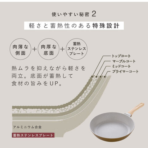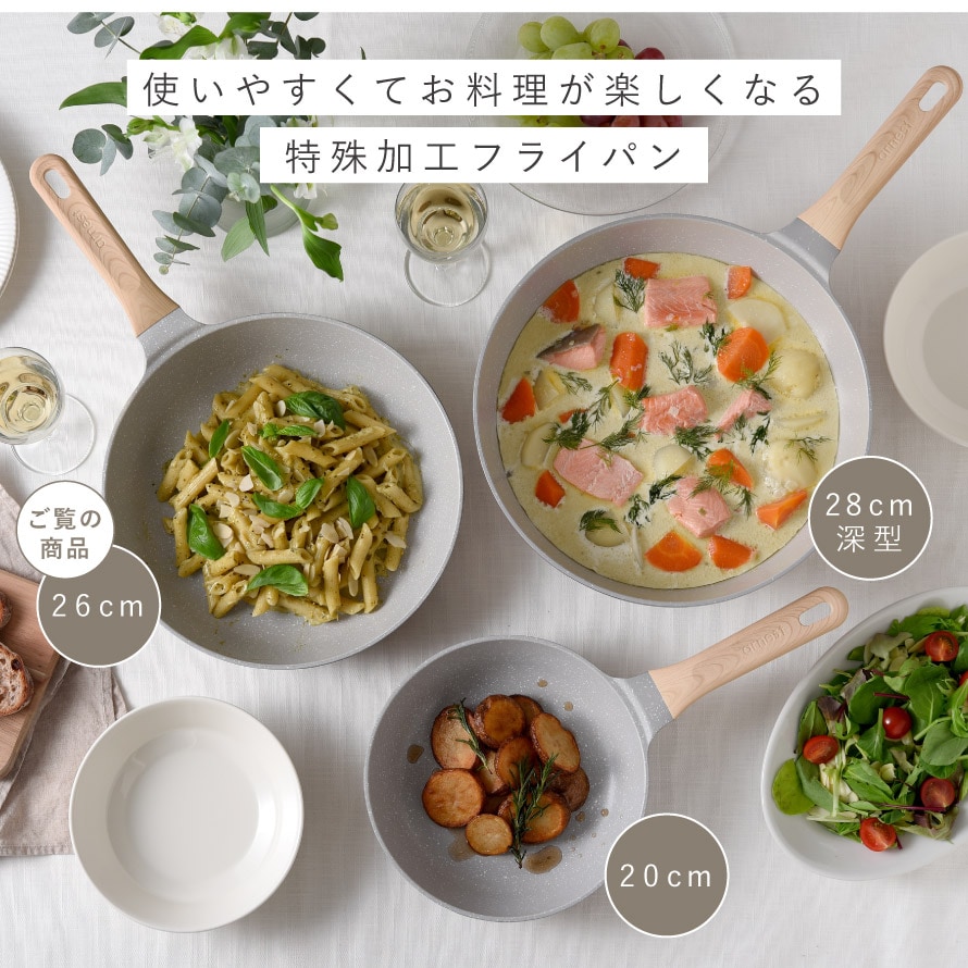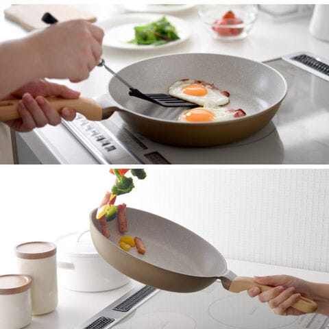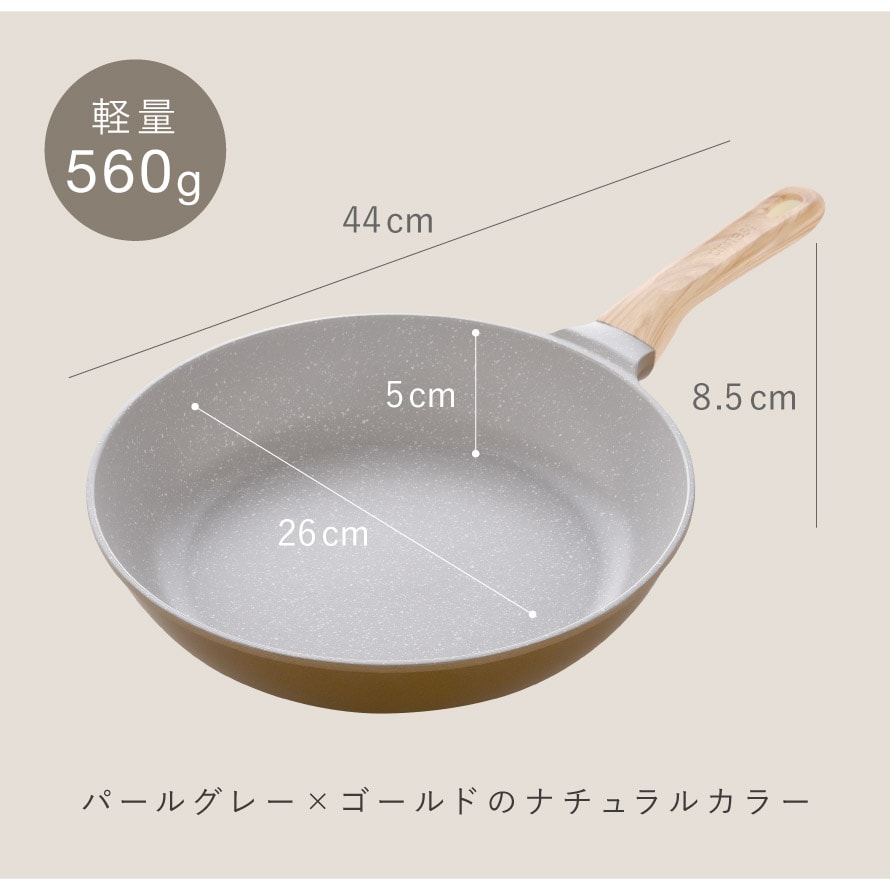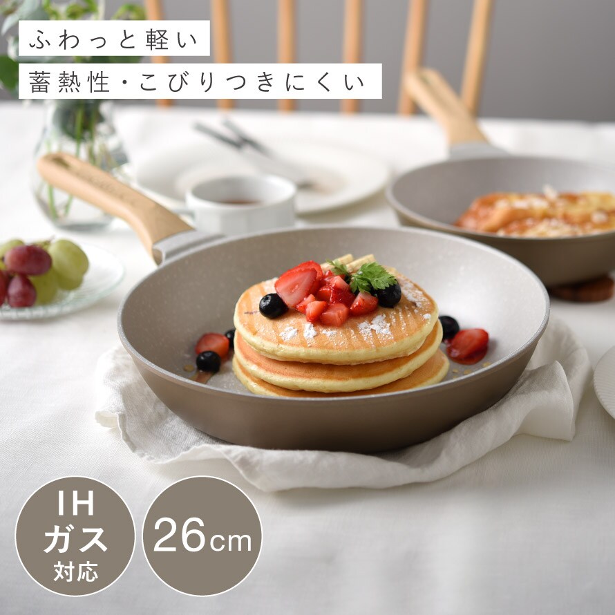 ふわっと軽く、蓄熱性で美味しく調理できる26cmフライパン。朝食づくりから夕食のおかずまで、日常使いにちょうどよく、キッチンにやさしくなじむナチュラルカラーのフライパンです。
