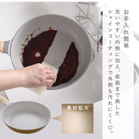 軽量設計で振りやすく、女性やご年配の方にも扱いやすいのが魅力。外面には高耐久の「シャインコーティング」を全面に施し、汚れが付きにくくお手入れも簡単。パールグレー×ゴールドのナチュラルカラーで、キッチンにやわらかな高級感を与えます。