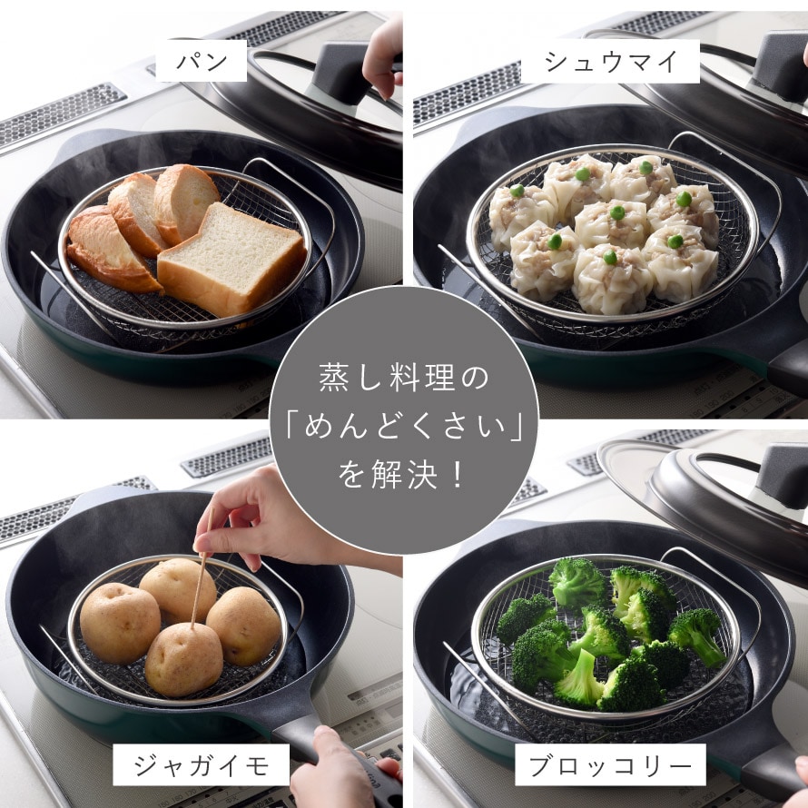 セイロや蒸し器などの専用調理器具を使わずに、普段お使いのフライパンを蒸し器として活用できます。フライパンに水を入れ、蒸し網に食材をのせて蓋をするだけで簡単に本格蒸し料理が完成します。