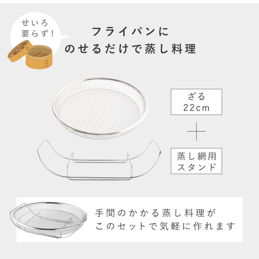 フライパンで手軽に蒸し料理が楽しめる「蒸し網用スタンド+お皿のざる22cm」のセットです。