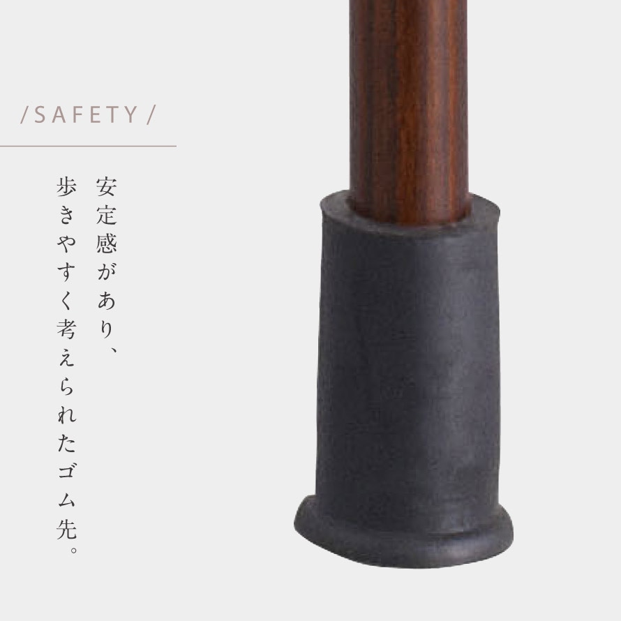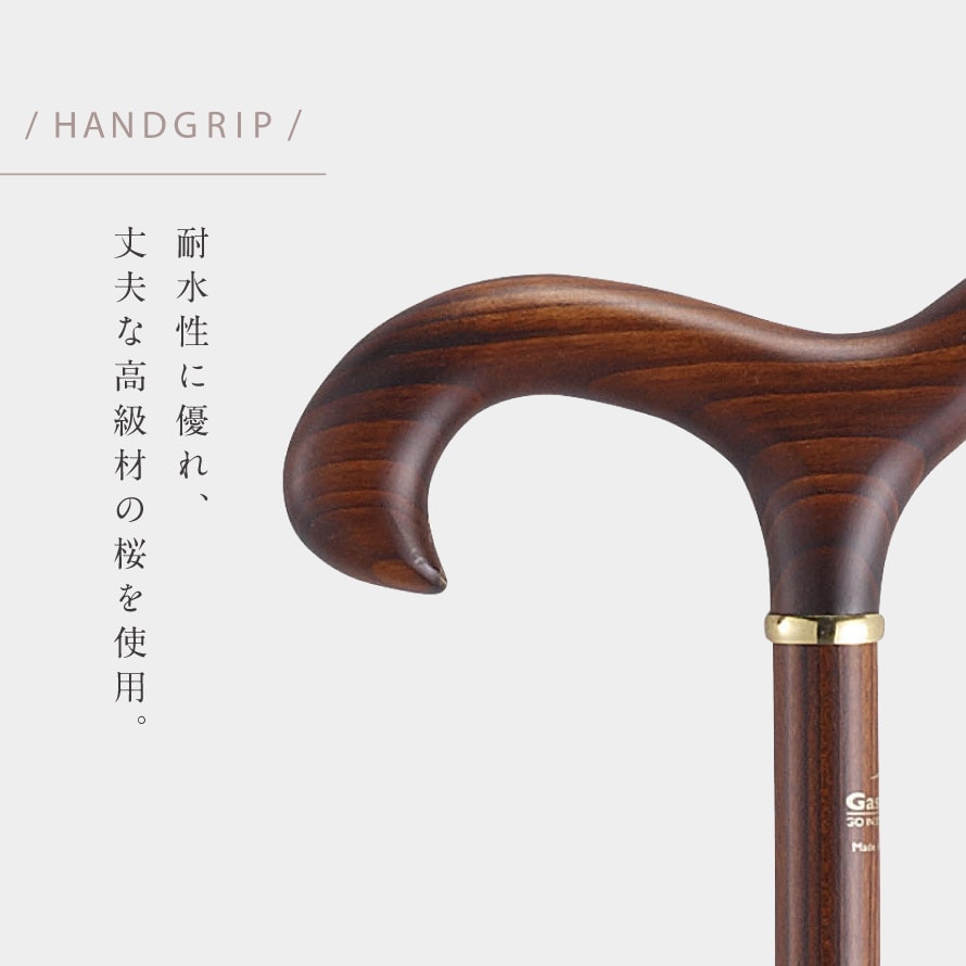 冬にグリップを握っても冷たさが少なく、手触りも滑らかな天然木。木目が美しく味わいのある親しみやすい杖です。