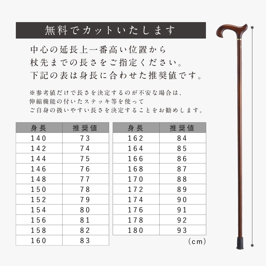 | 杖カットの注意事項 | ご希望の長さに無料でカットさせていただきます。カットされた杖は、返品や交換の対象外です。杖カットをご希望の場合、代金引換でのご注文はお受けできません。 |