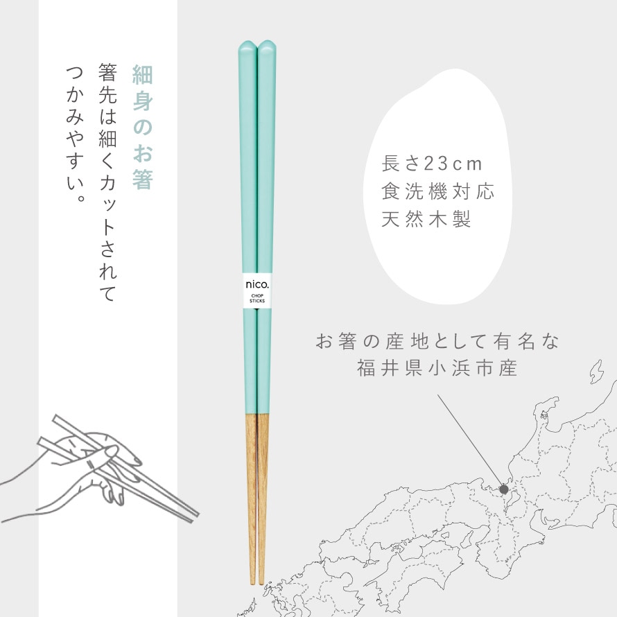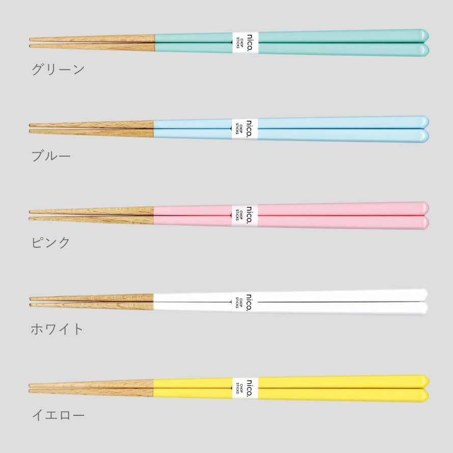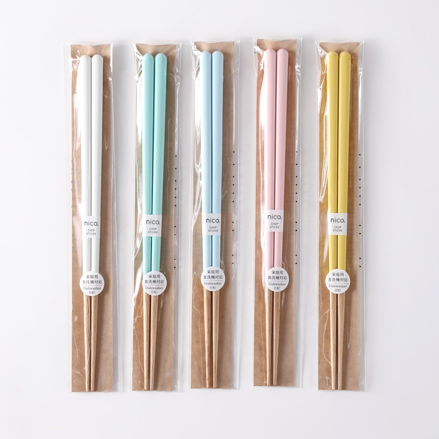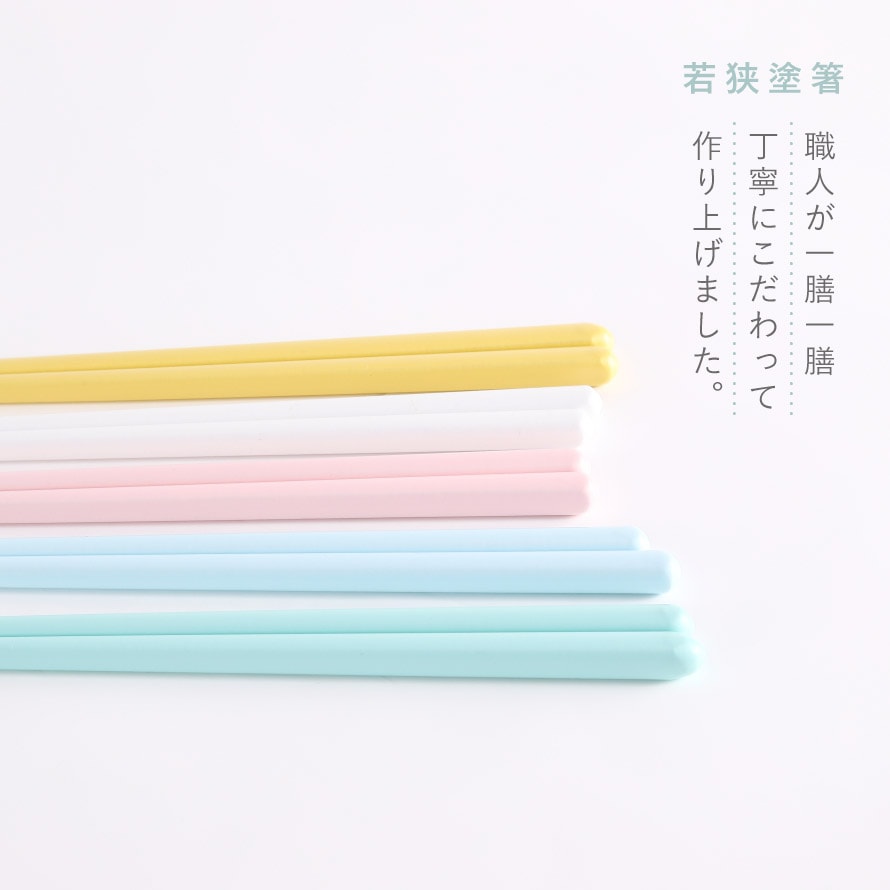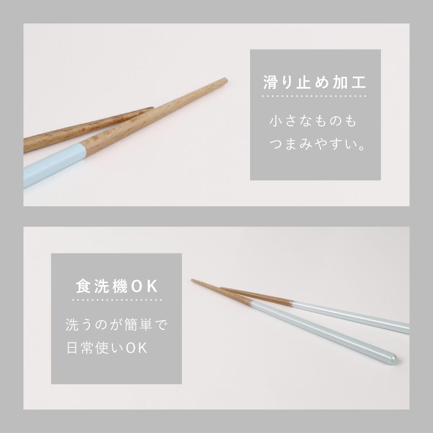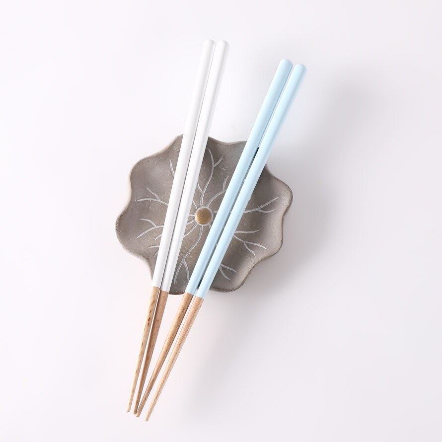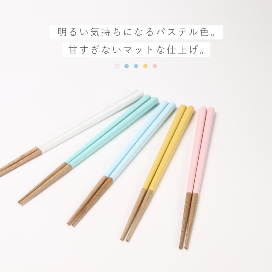 箸先の天然木らしい自然な色と、パステルカラーの組み合わせ。甘すぎないマットな質感が上品な仕上がり。