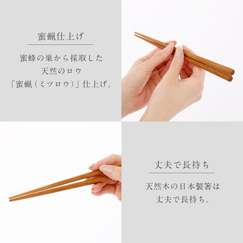 ミツバチの巣から採取した天然のロウ「蜜蝋(ミツロウ)」仕上げ。天然木の日本製箸は丈夫で長持ちします。