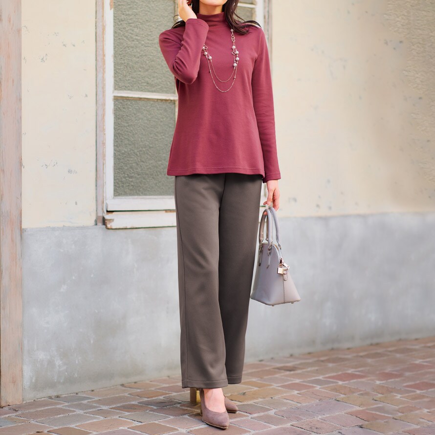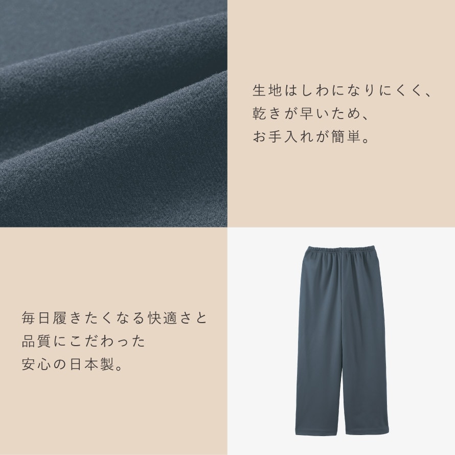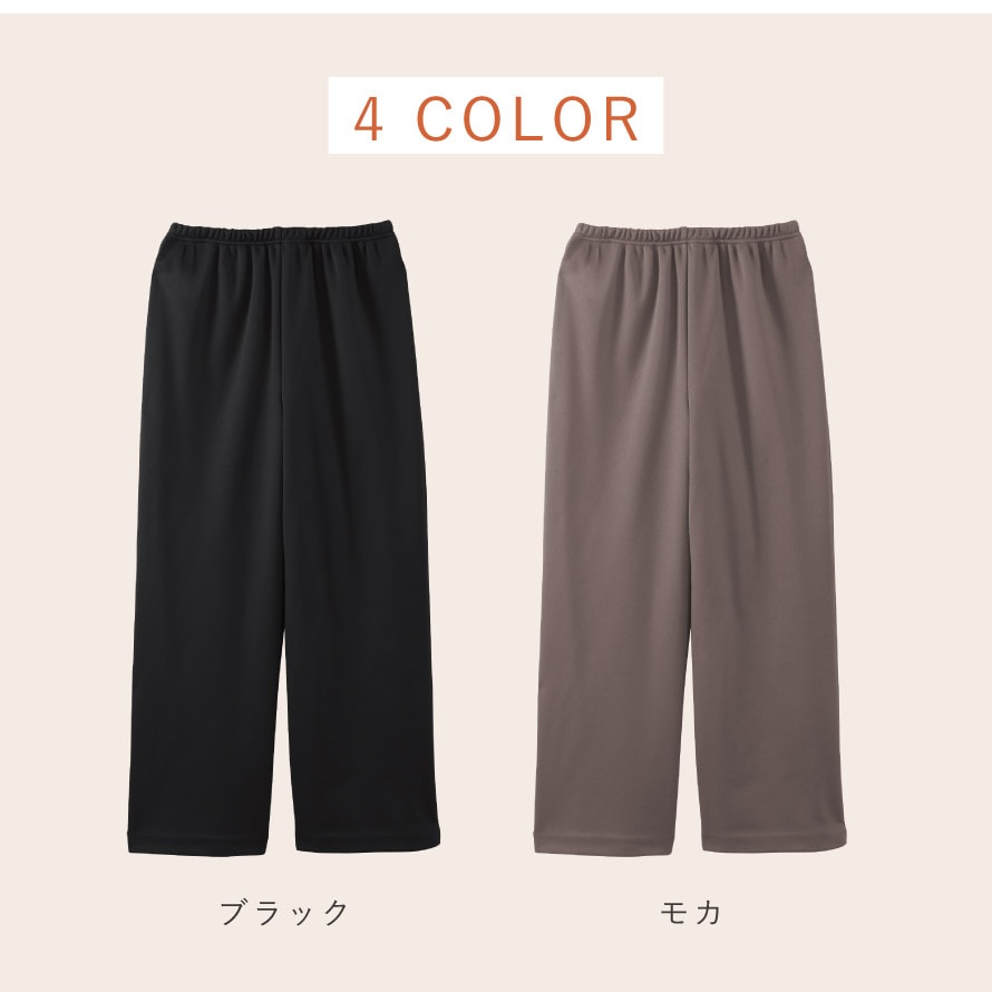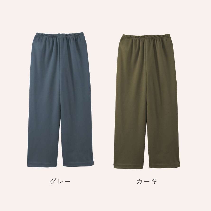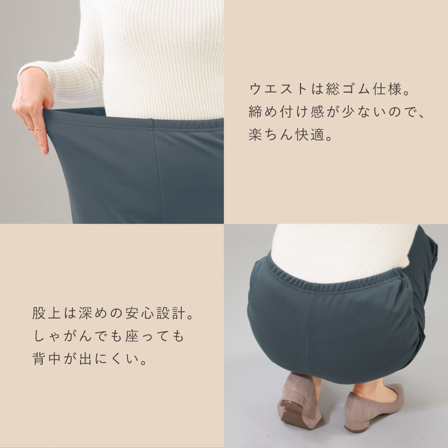 裏側はふんわりと柔らかい裏起毛で、履いた瞬間にひやっとしない心地良さが特徴。股上は深めの安心設計で、しゃがんだり座ったりしても背中が出にくく、シニア世代の方からも「安心して履ける」と好評です。ウエストは総ゴム仕様で締め付け感が少なく、ストレッチ素材なので長時間履いていてもラク。体型が変わりやすい年代の方にも快適に着ていただける履き心地です。