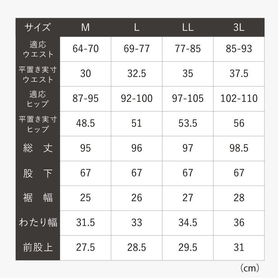 サイズM/適応ウエスト64-70、適応ヒップ87-95、総丈95、裾幅25、わたり幅31.5、前股上27.5、L/適応ウエスト69-77、適応ヒップ92-100、総丈96、裾幅26、わたり幅33、股上28.5、LL/適応ウエスト77-85、適応ヒップ97-105、総丈97、裾幅27、わたり幅34.5、股上29.5、3L/適応ウエスト85-93、適応ヒップ102-110、総丈98.5、裾幅28、わたり幅36、股上31cm