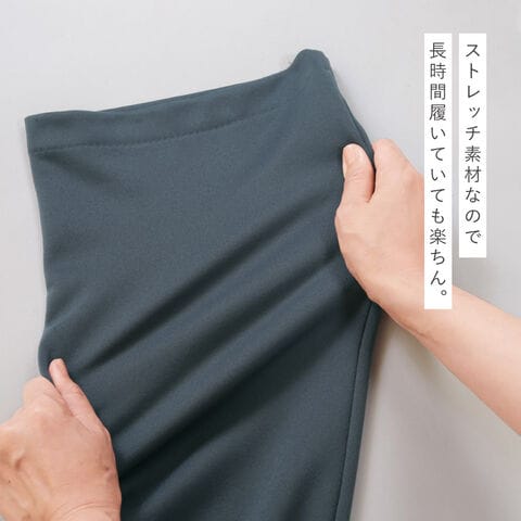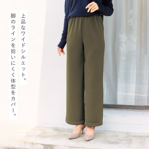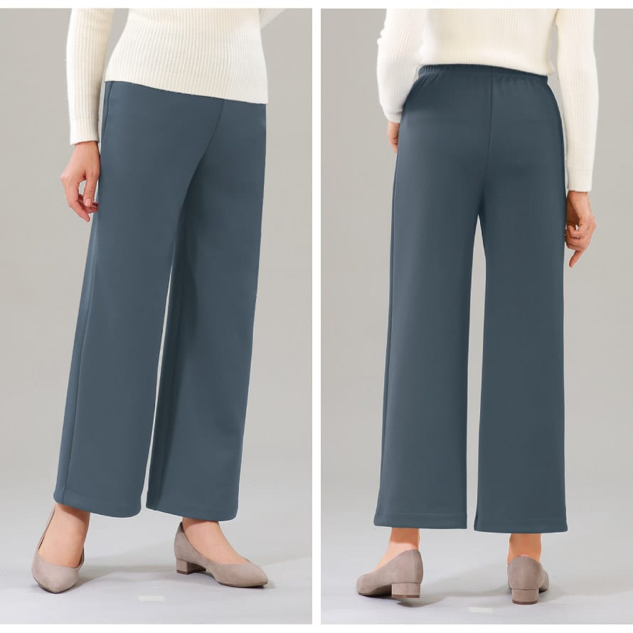 素材はシワになりにくく、洗っても乾きやすいため、お手入れも簡単。旅行や通院、室内着、ちょっとした外出にも使える便利な一本です。見た目はすっきり上品なワイドシルエットで、脚のラインを拾いにくく自然に体型をカバーしてくれるのも嬉しいポイント。ポケットを付けないことで腰まわりが膨らまず、きれいなラインで履いていただけます。