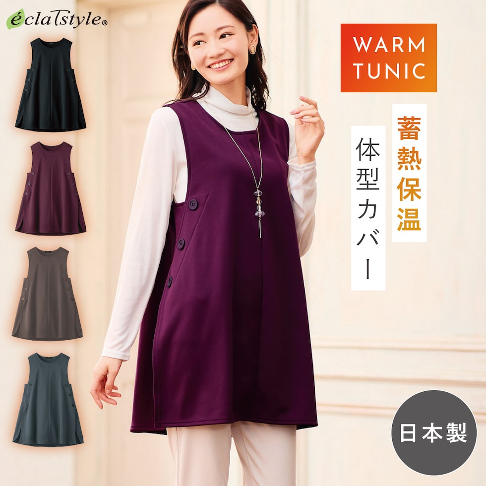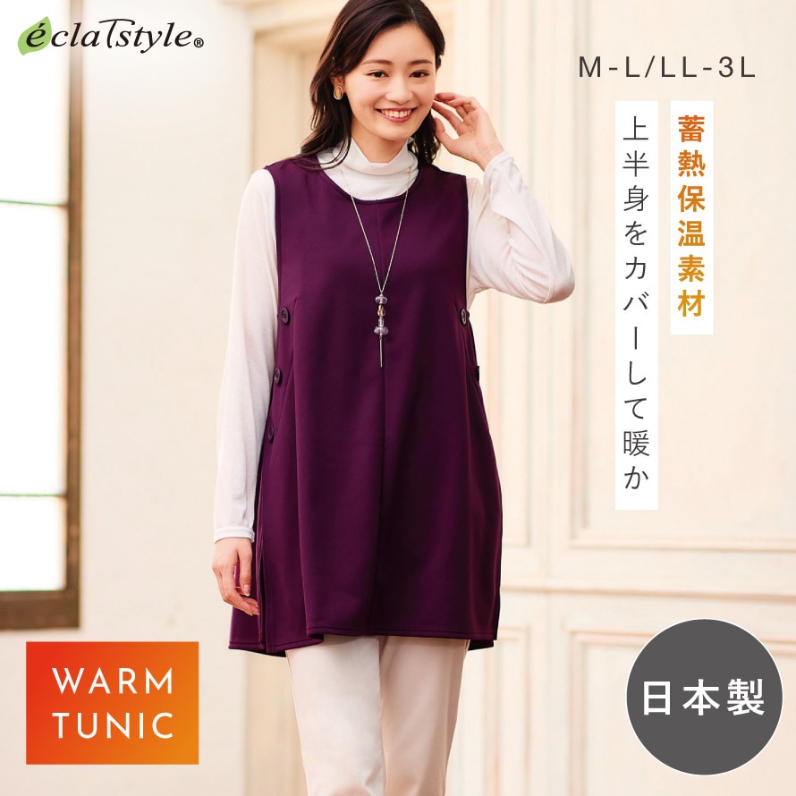 あったか ベスト レディース 裏起毛 日本製 軽い 吸熱 保温 ホットヴェール M-L LL-3L ゆったり 大きいサイズ 体型カバー お腹 腰 あったか チュニックベスト 50代 60代 70代 80代 冬用 裏起毛ボタンアクセントチュニックベスト