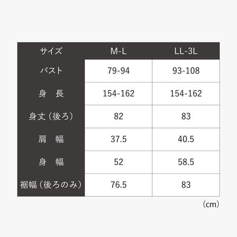 | サイズ | M-L/身長154-162、バスト79-94、後ろ身丈82、肩幅37.5、身幅52、後ろ裾幅76.5、LL-3L/身長154-162、バスト93-108、後ろ身丈83、肩幅40.5、身幅58.5、後ろ裾幅83cm |