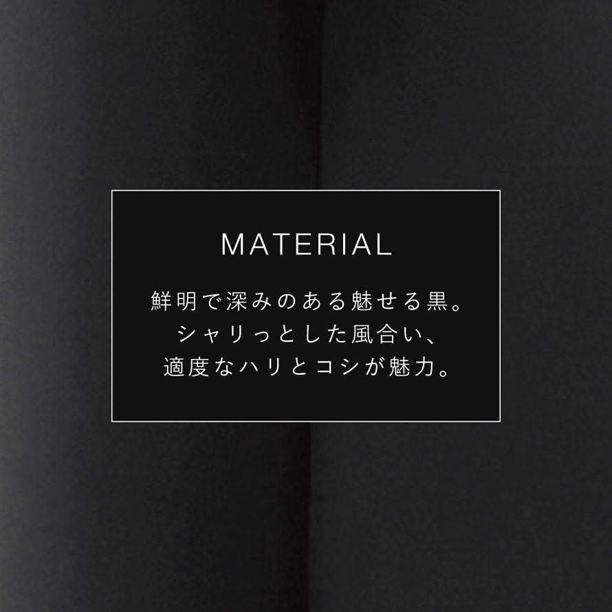 鮮明で深みのある魅せる黒を表現。シャリっとしたソフトな肌触りと風合い、適度なハリとコシが魅力。本格派のブラックフォーマル素材です。