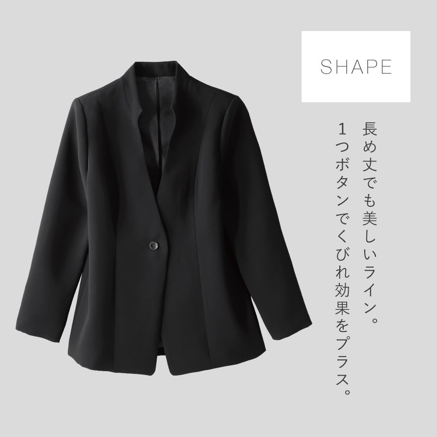 ウエストラインを引き立てる1つボタン仕様で、さりげないくびれ効果をプラス。無理のない着心地ながら、きちんと感のある仕上がりです。