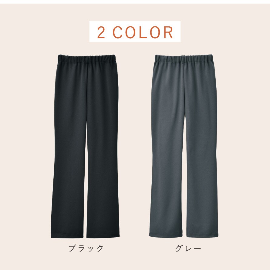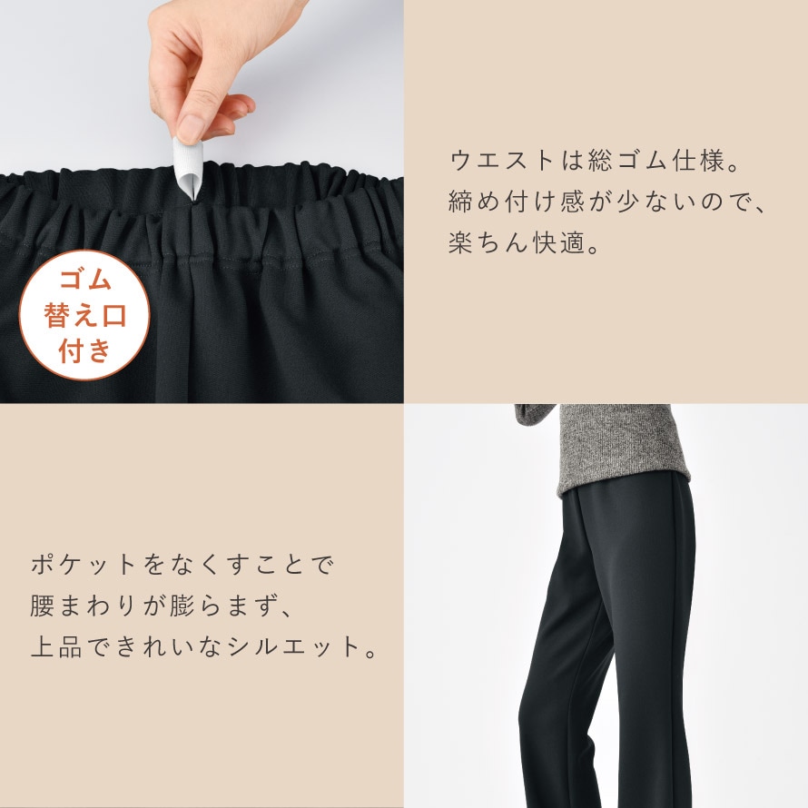 ウエストは締め付けにくい総ゴム仕様で長時間履いてもラク。さらに 「ゴム替え口つき」なので、ご自身で調整しながら長く愛用できます。ポケットをなくすことで腰まわりが膨らまず、上品できれいなシルエットをキープできます。