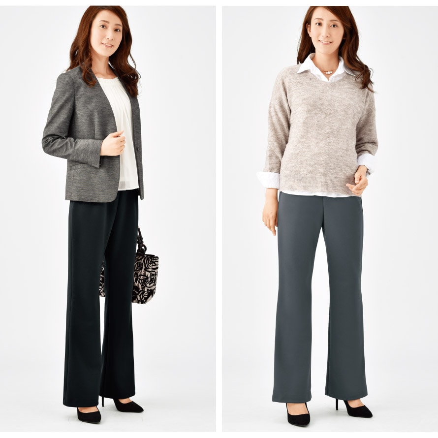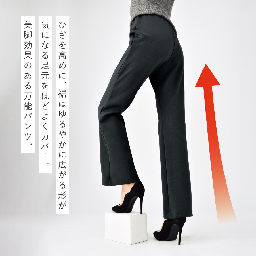 シルエットは、ひざ位置を高く設計した脚長・美脚ライン。体型を拾いにくく、すっきりきれいに見えるのが嬉しいポイントです。