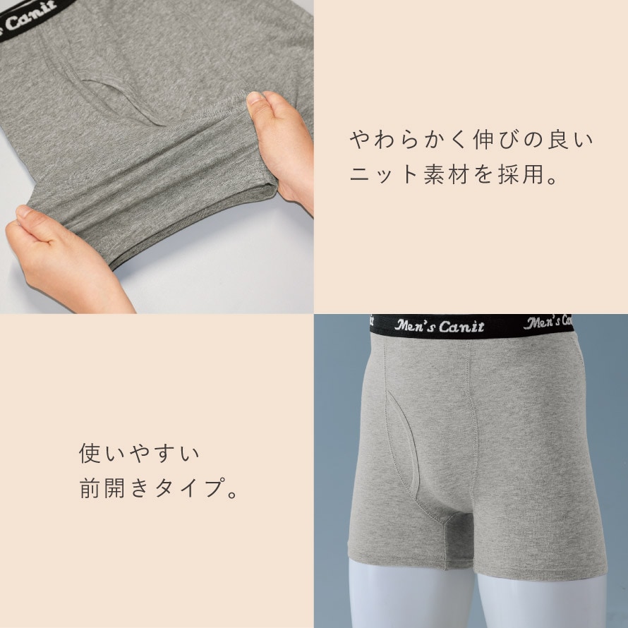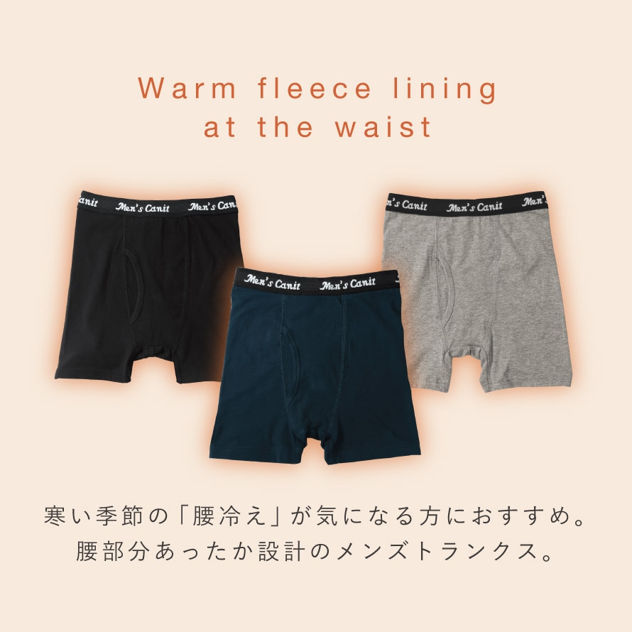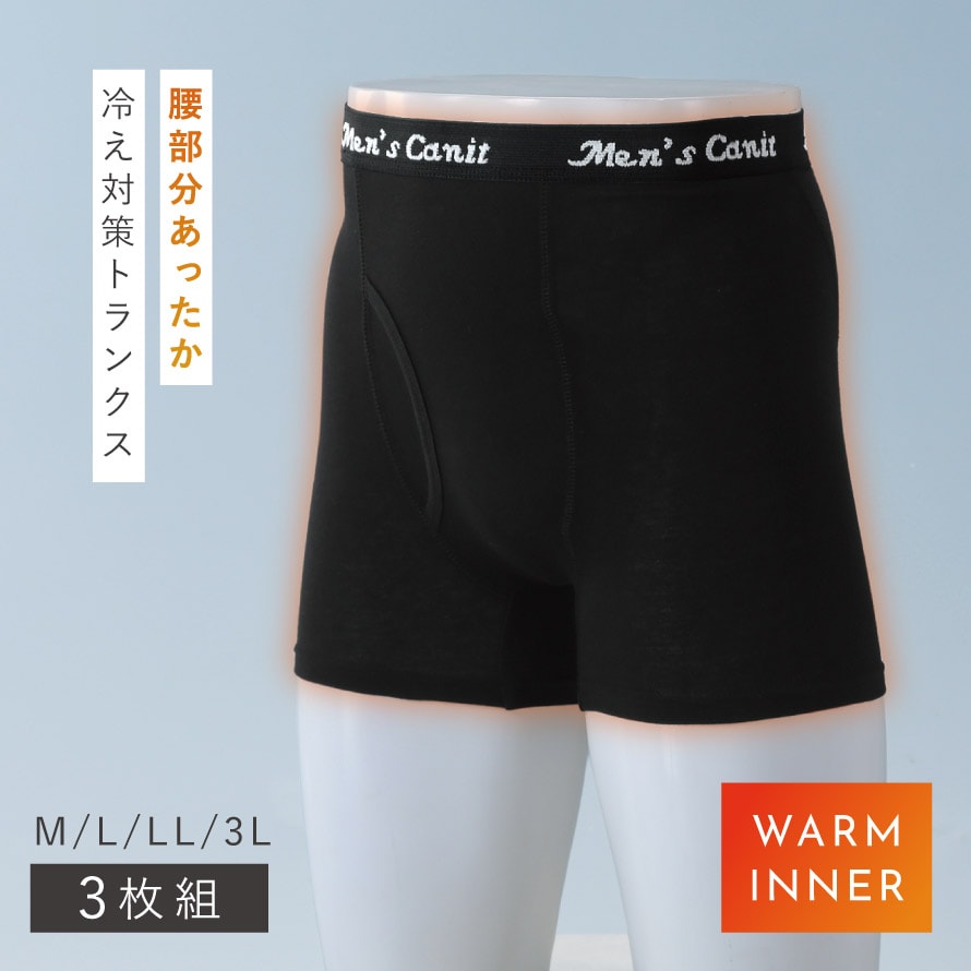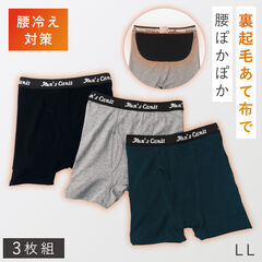 カラーはブラック・グレー・ネイビーの使いやすい3色組。サイズはMから3Lまで幅広くご用意しました。「寒くなると腰から冷える」「お腹や腰を触るといつも冷たい」「下半身の冷えが気になる」そんな方に一度お試しいただきたい、冬の頼れるあったかメンズトランクスです。