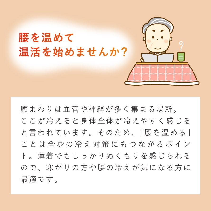 腰まわりは血管や神経が多く集まる場所。ここが冷えると身体全体が冷えやすく感じると言われています。そのため、「腰を温める」ことは全身の冷え対策にもつながるポイント。薄着でもしっかりぬくもりを感じられるので、寒がりの方や腰の冷えが気になる方に最適です。