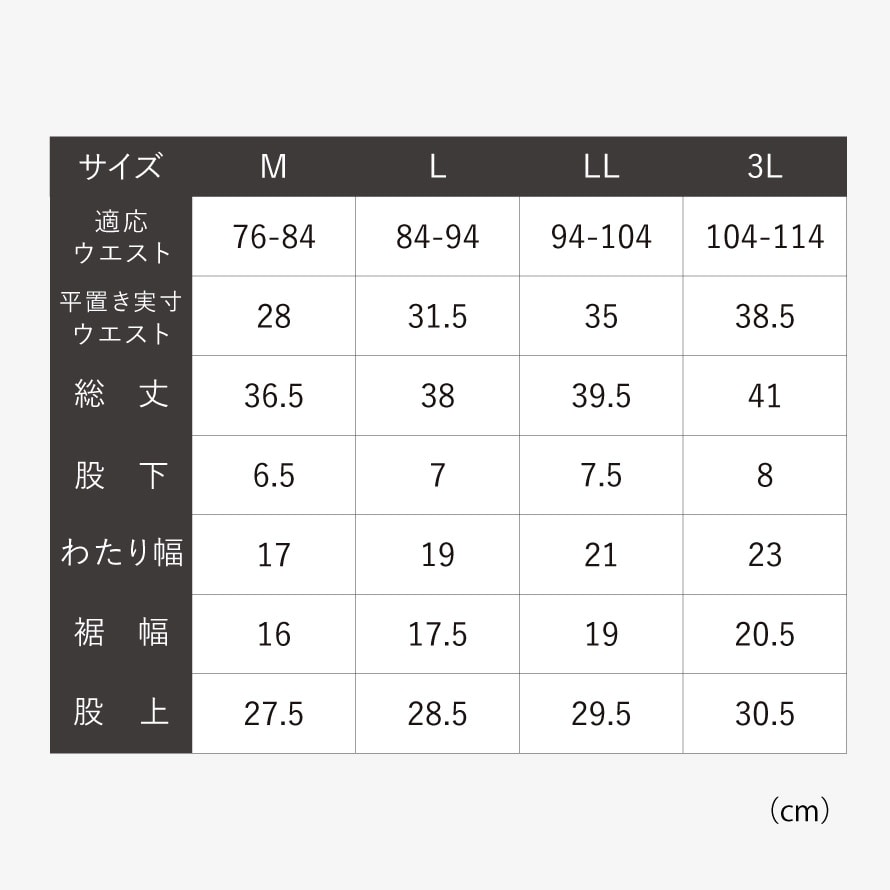 | サイズ | M/適応ウエスト76-84、総丈36.5、股下6.5、わたり幅17、裾幅16、股上27.5、L/適応ウエスト84-94、総丈38、股下7、わたり幅19、裾幅17.5、股上28.5、LL/適応ウエスト94-104、総丈39.5、股下7.5、わたり幅21、裾幅19、股上29.5、3L/適応ウエスト104-114、総丈41、股下8、わたり幅23、裾幅20.5、股上30.5cm |