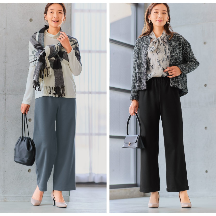 見た目はすっきり上品なワイドシルエットで、脚のラインを拾いにくく自然に体型をカバーしてくれるのも嬉しいポイント。ポケットを付けないことで腰まわりが膨らまず、きれいなラインで履いていただけます。