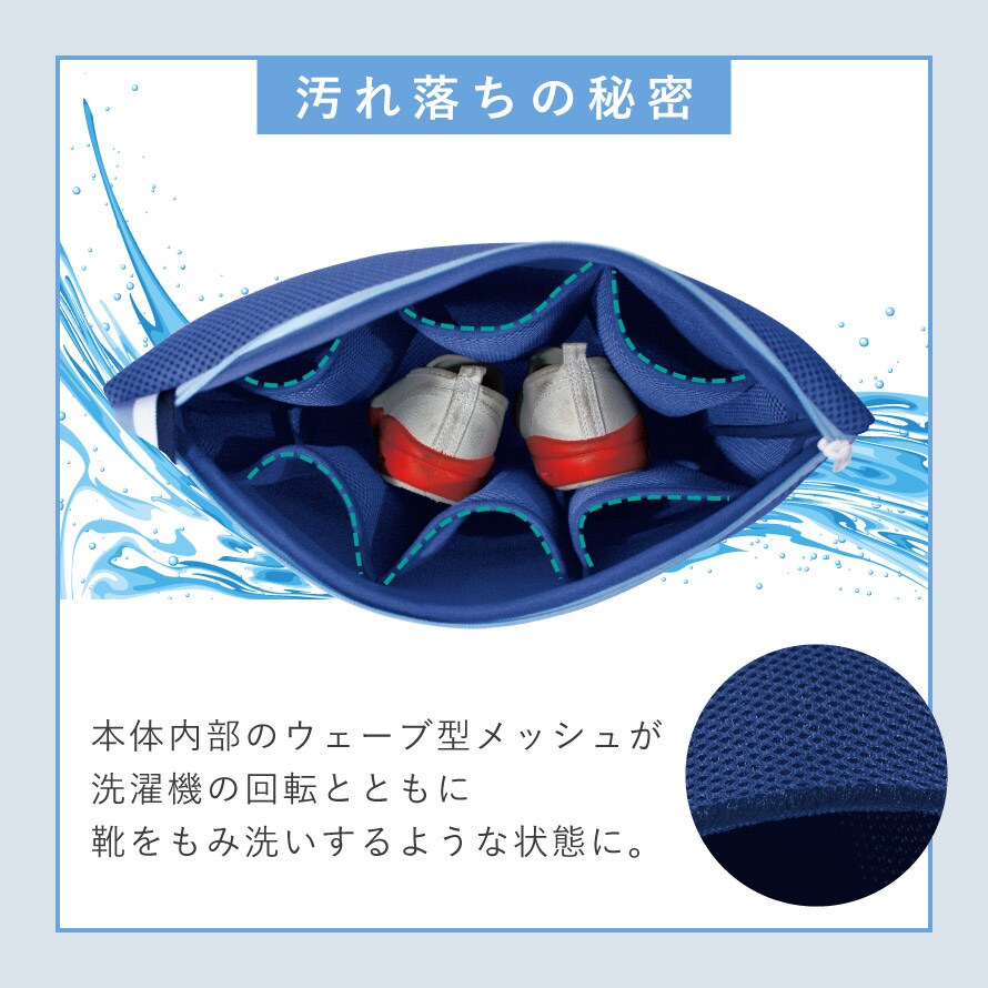 本体内部のウェーブ型メッシュが、洗濯機の回転とともに靴をもみ洗いするような状態に。