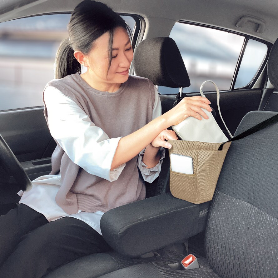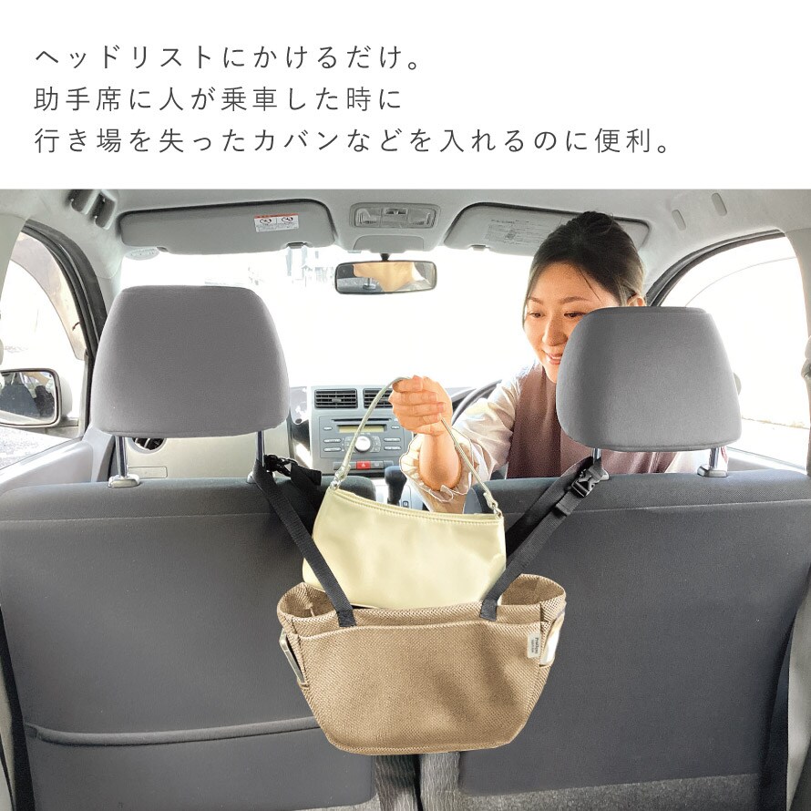 ヘッドレストにかけるだけの簡単取付。