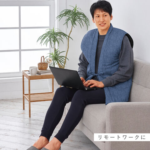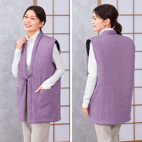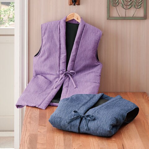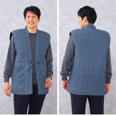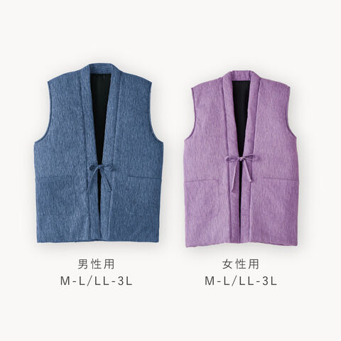 軽さと暖かさを両立し、体温を逃しにくい素材です。一般的な袖なし半纏(中綿ベスト)に比べ軽く、シニアの方にも負担なく羽織れる軽やかさに仕上がりました。