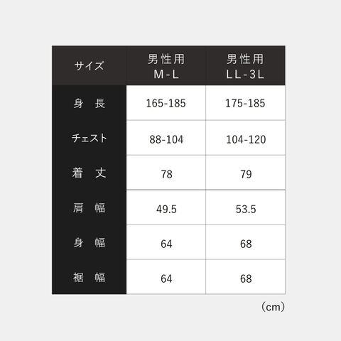 サイズ男性用M-L/身長165-185、チェスト88-104、着丈78、肩幅49.5、身幅64、裾幅64、男性用LL-3L/身長175-185、チェスト104-120、着丈79、肩幅53.5、身幅68、裾幅68cm、女性用M-L/身長154-162、バスト79-94、着丈74、肩幅46、身幅59、裾幅59、女性用LL-3L/身長154-162、バスト93-108、着丈75、肩幅50、身幅63、裾幅63cm