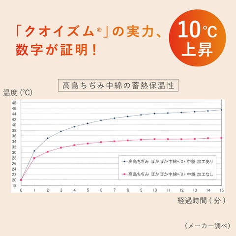 日本の伝統生地「高島ちぢみ」と、岩崎産業の蓄熱発熱中綿「クオイズム」を合わせた、軽くて暖かいベストができました。体温を逃しにくく、メーカー比較データでは一般的な中綿より約10度も暖かい結果が出ています。(メーカー調べ)