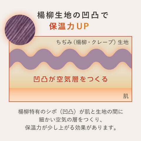 この凹凸が生地の間に細かな空気層をつくり、ふんわり軽くやわらかな着心地に。空気を含むことで冷たい空気を遮り、自然な暖かさが続きます。