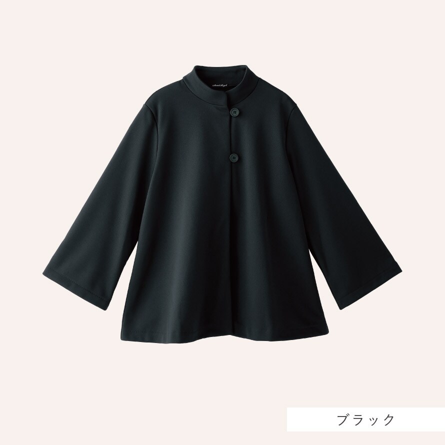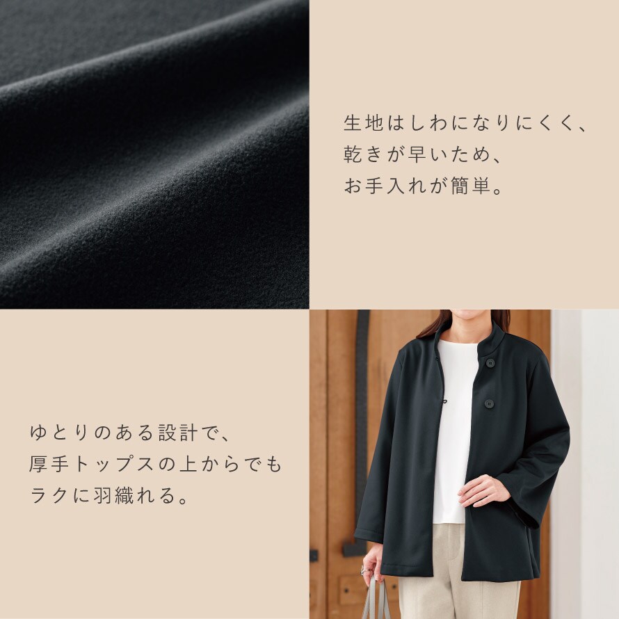 生地はしわになりにくく、乾きが早いため、お手入れが簡単で毎日の防寒着にぴったり。着脱しやすいボタン留めに加え、前身頃には上品なループ留めをあしらい、シニアの装いにさりげないお洒落のアクセントを添えます。