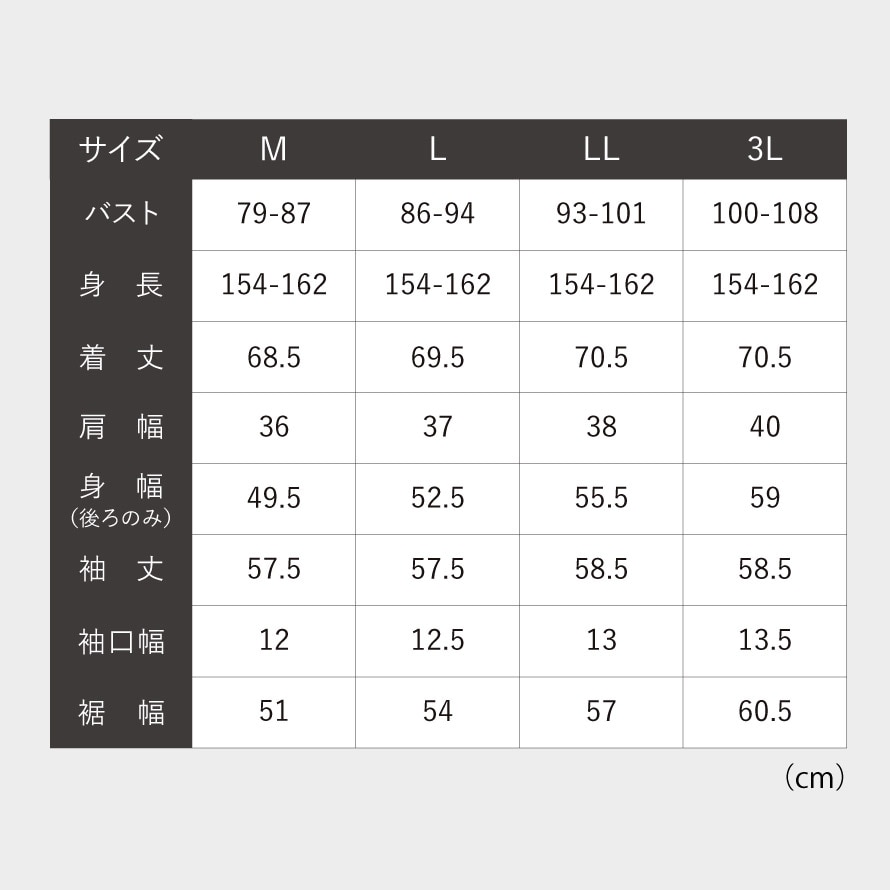 | サイズ | 身長154-162、M/バスト79-87、着丈68.5、肩幅36、身幅(後ろのみ)49.5、袖丈57.5、袖口幅12、裾幅51、L/バスト86-94、着丈69.5、肩幅37、身幅(後ろのみ)52.5、袖丈57.5、袖口幅12.5、裾幅54、LL/バスト93-101、着丈70.5、肩幅38、身幅(後ろのみ)55.5、袖丈58.5、袖口幅13、裾幅57、3L/バスト100-108、着丈70.5、肩幅40、身幅(後ろのみ)59、袖丈58.5、袖口幅13.5、裾幅60.5cm |
