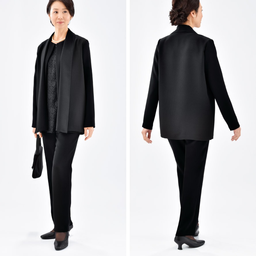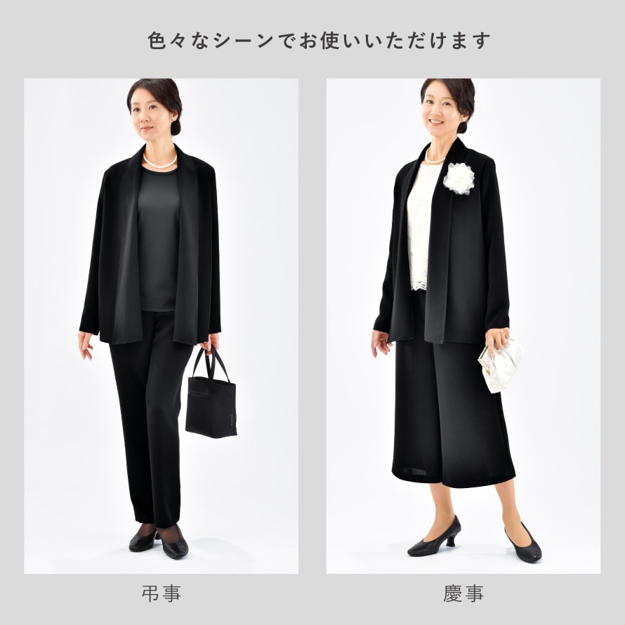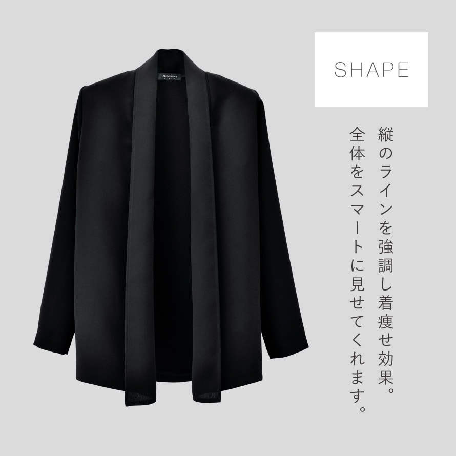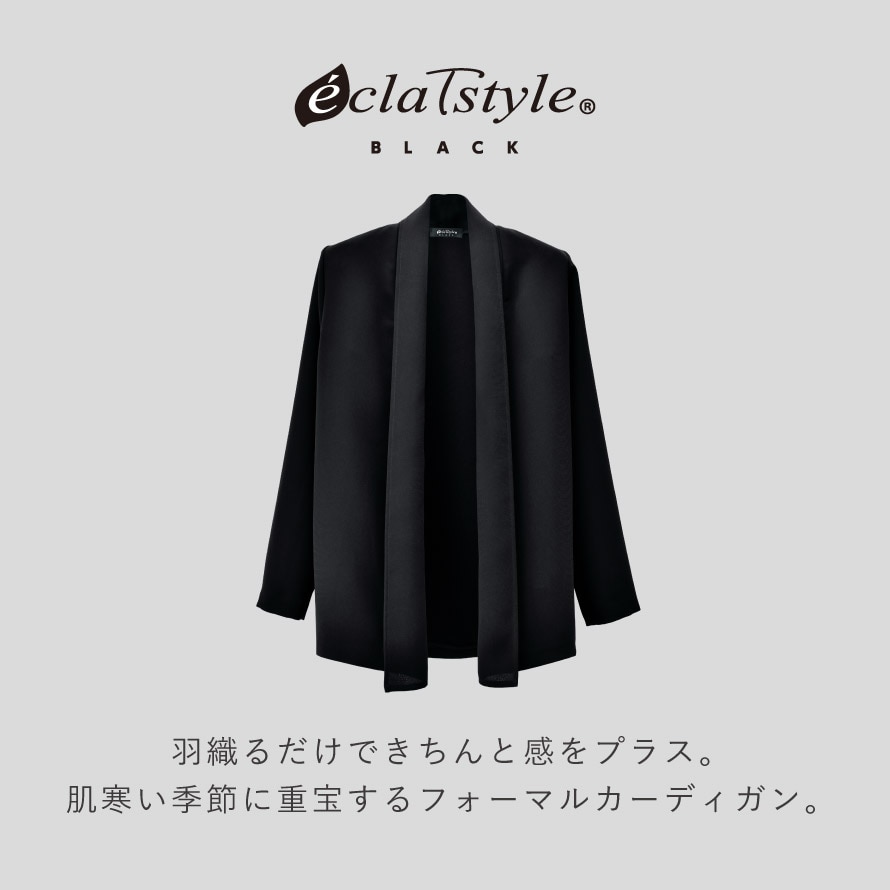 季節の変わり目や冷房対策にも活躍し、礼装スタイルを快適に。一枚あると安心のフォーマルカーディガンです。手持ちの黒パンツを合わせるだけで、きちんと感のある上品な装いに。
